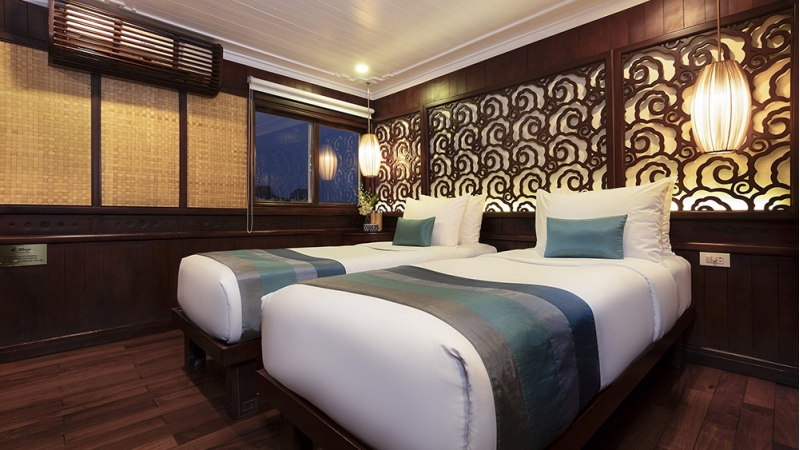 The Deluxe Cabin Classic offers a warm and inviting retreat, thoughtfully designed for a comfortable cruise experience in Ha Long Bay. Featuring a large panoramic window, the cabin allows natural light to fill the space while framing serene views of emerald waters. It is an ideal choice for travelers seeking a cozy yet stylish stay, complemented by relaxing activities such as sunset happy hour and kayaking through the bay’s tranquil scenery.