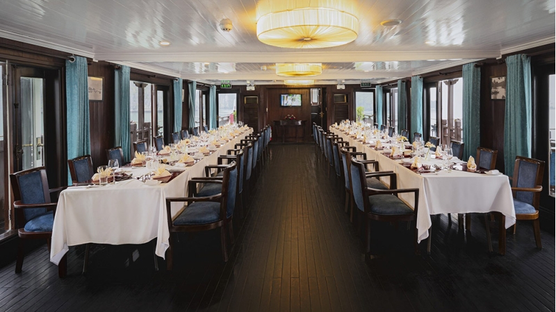 Each cabin reflects the charm of classic Asian design combined with modern comfort. Deluxe Cabins provide a warm and well-appointed space of 12–14 sqm, while Terrace Suites elevate the experience with private terraces and sun loungers—perfect for embracing the serenity of the bay. Rich wooden floors, spacious bathrooms, and large panoramic windows in every cabin create a welcoming retreat where guests can unwind while surrounded by Ha Long Bay’s ever-changing scenery.