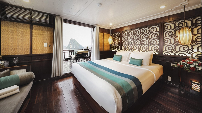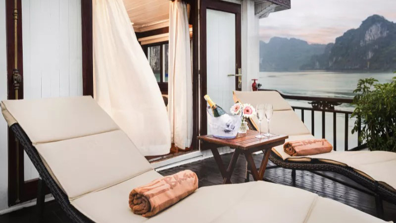 The Terrace Suite provides a more spacious and intimate setting, perfect for couples looking to enjoy special moments together. With its private terrace, this suite invites guests to unwind with sunset cocktails, soak in the peaceful surroundings, and fully embrace the natural beauty of Ha Long Bay. Elegant interiors, generous space, and outdoor privacy make it an excellent choice for a truly memorable cruise experience.