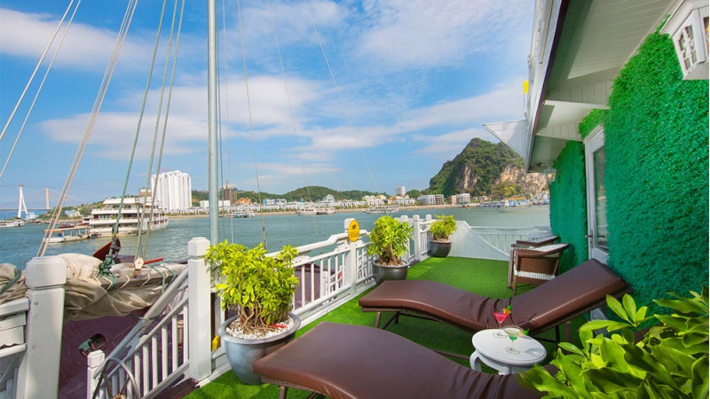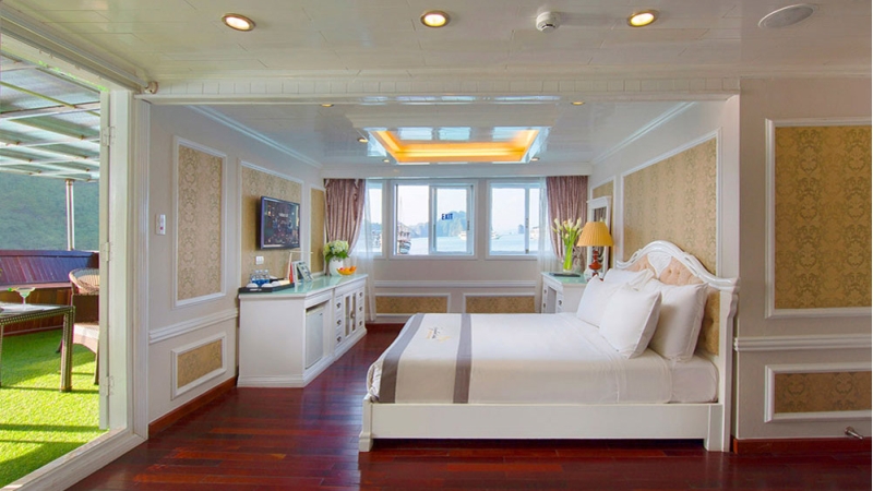 Positioned at the front of the vessel, the Exclusive Suite offers one of the most impressive vantage points on board. With a private terrace and panoramic views of Bai Tu Long Bay, this 32 m² suite includes one double bed and one single bed, making it a perfect choice for small families or groups seeking both comfort and scenery.