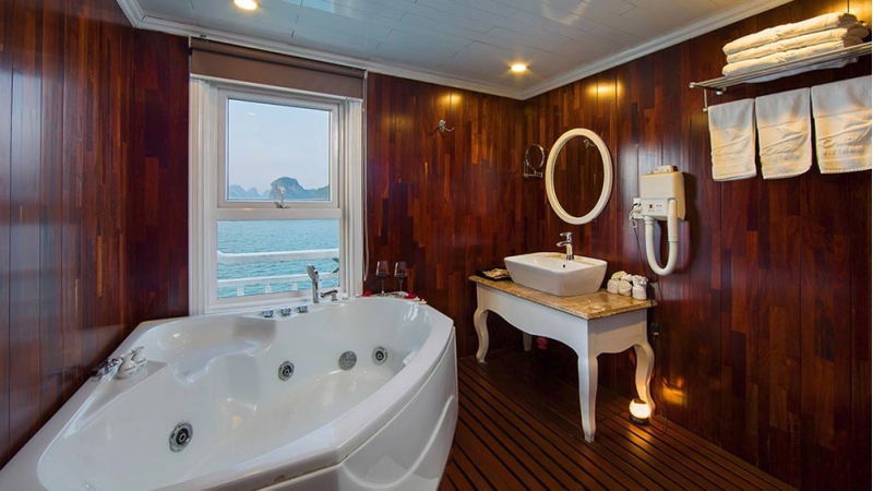 Cabins aboard Signature Cruise are thoughtfully designed to combine classic elegance with modern comfort. Inspired by neoclassical style and crafted with warm wooden interiors, each cabin offers a relaxing retreat with high-quality amenities, private balconies, and panoramic views of Bai Tu Long Bay—creating a refined and immersive cruising experience.