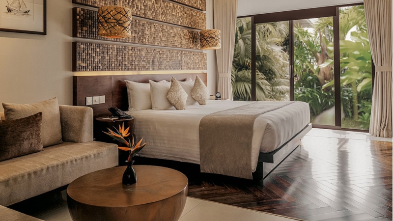 Surrounded by terraced gardens, this room provides a calm and intimate atmosphere. Soft natural tones, flowing drapery, and a spacious bed create a restful retreat, complemented by a private balcony overlooking lush greenery.
