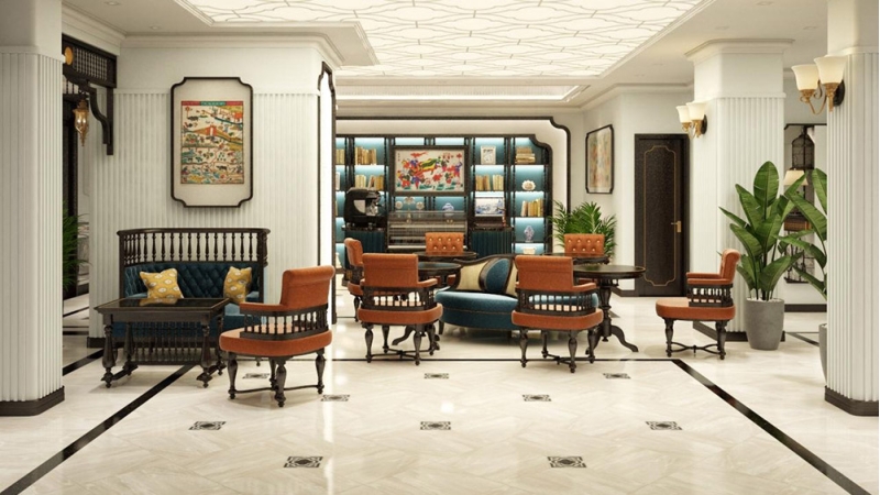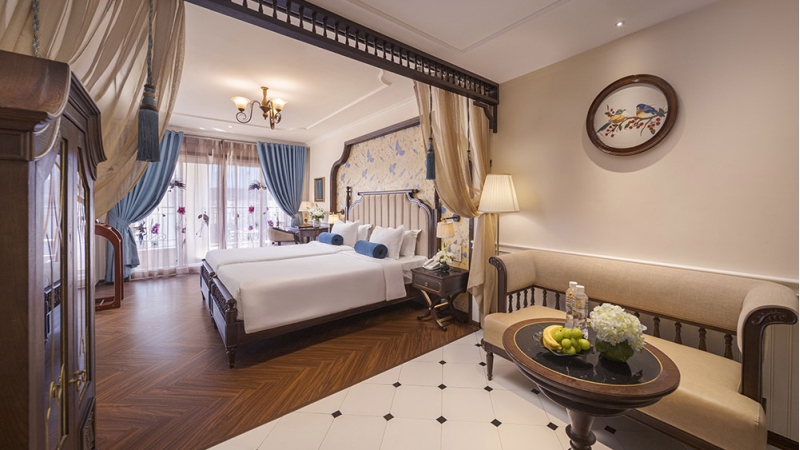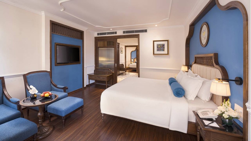 Inspired by elegant Indochine design, the Junior Suite features a spacious private balcony with comfortable seating, ideal for unwinding while enjoying panoramic city views. Inside, the suite includes a cozy sitting area with a sofa and coffee table, a flat-screen TV, and an en-suite bathroom with a separate bathtub and shower. Guests staying in this suite also enjoy exclusive afternoon tea privileges.